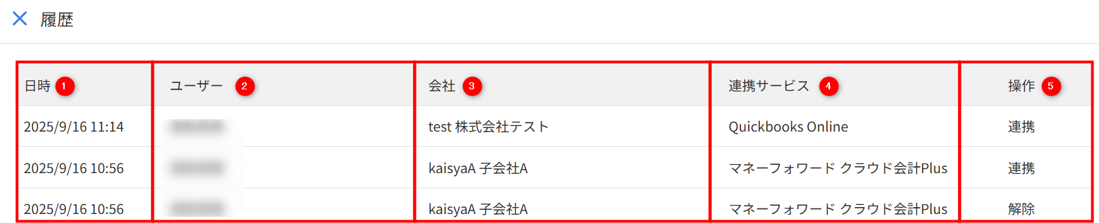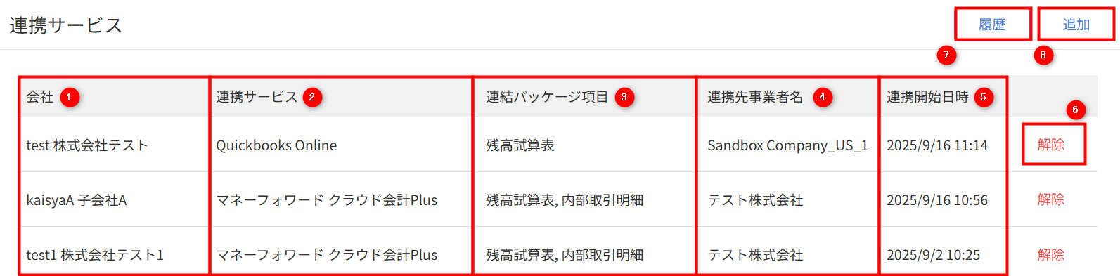 ③ | 会社 | 連携サービスを連携した会社名が表示されます。 |