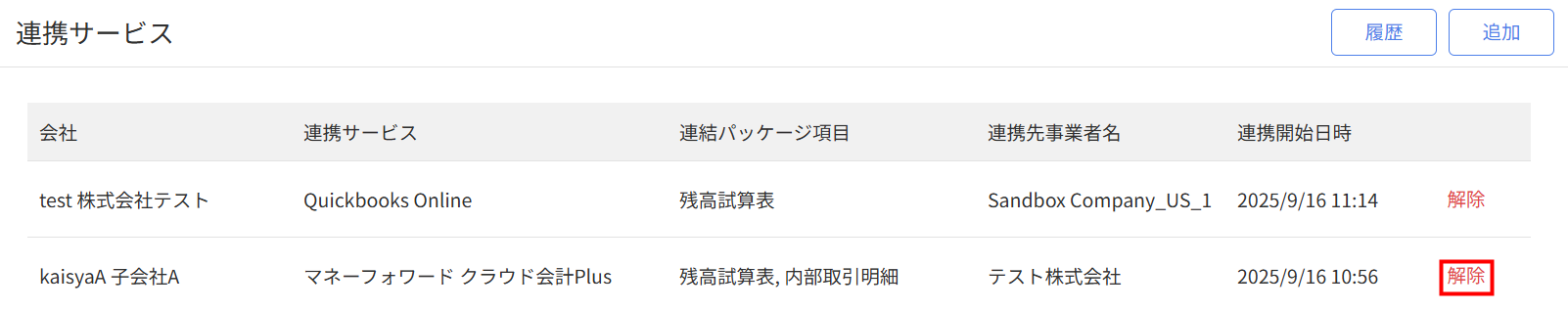 「連携サービス」画面で「履歴」をクリックすると、連結サービスの連携・解除の操作履歴を確認できます。
