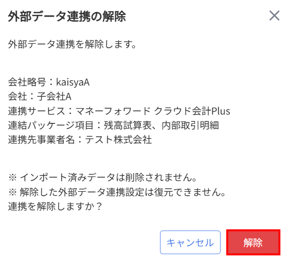 - 「外部データ連携の解除」画面で内容を確認し、問題がなければ「解除する」をクリックします。