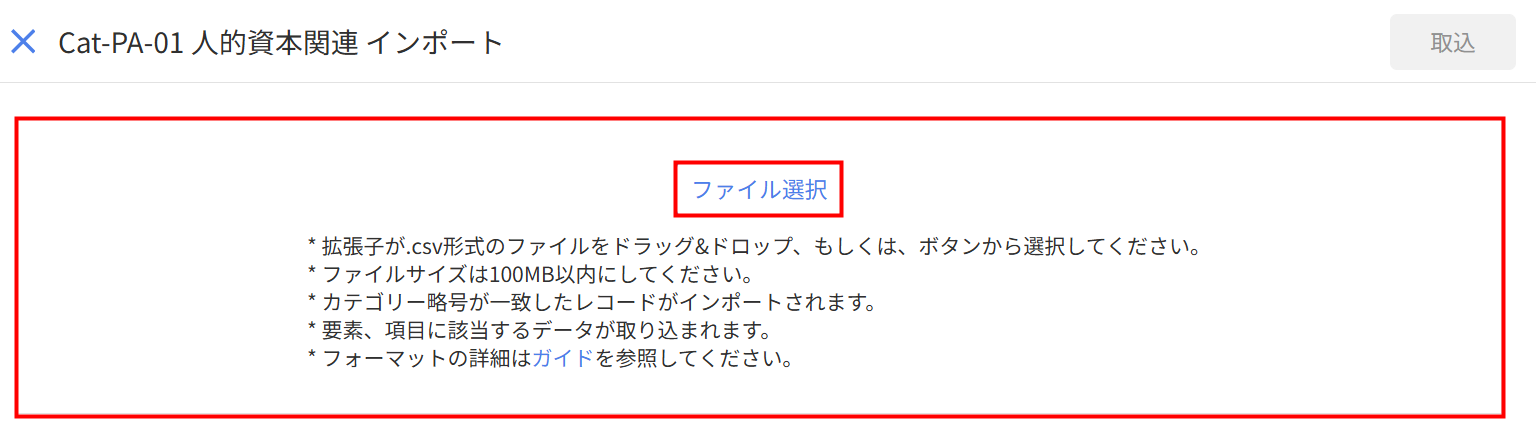 - 「ファイル選択」をクリックしてインポートするファイルを選択するか、ファイルをドラッグ&ドロップします。