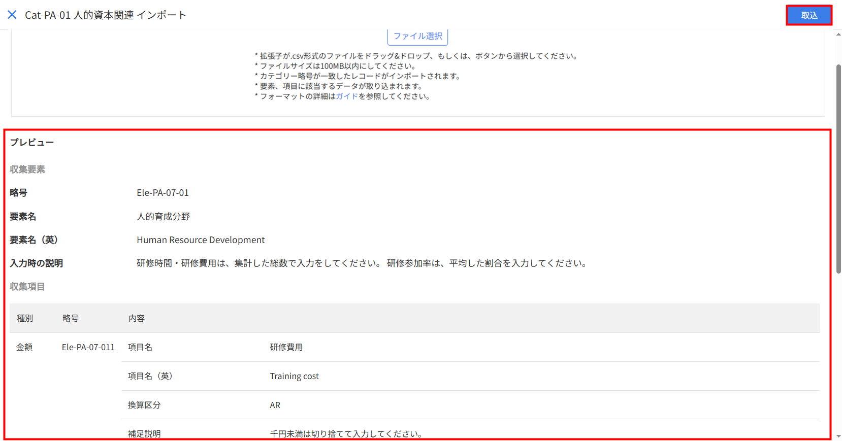 - 「プレビュー」に表示された内容を確認し、問題がなければ「取込」をクリックします。