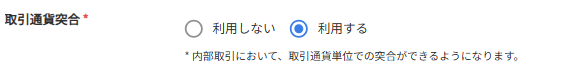 「内部取引明細(取引通貨)」のインポートを行う場合、「連結決算単位」画面で対象の連結決算単位の「取引通貨突合」で「利用する」を選択します。