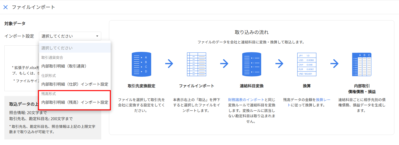 | Excelファイルをインポート | 内部取引明細(取引通貨) | Excel | 報告通貨金額と取引通貨金額をともに登録 |