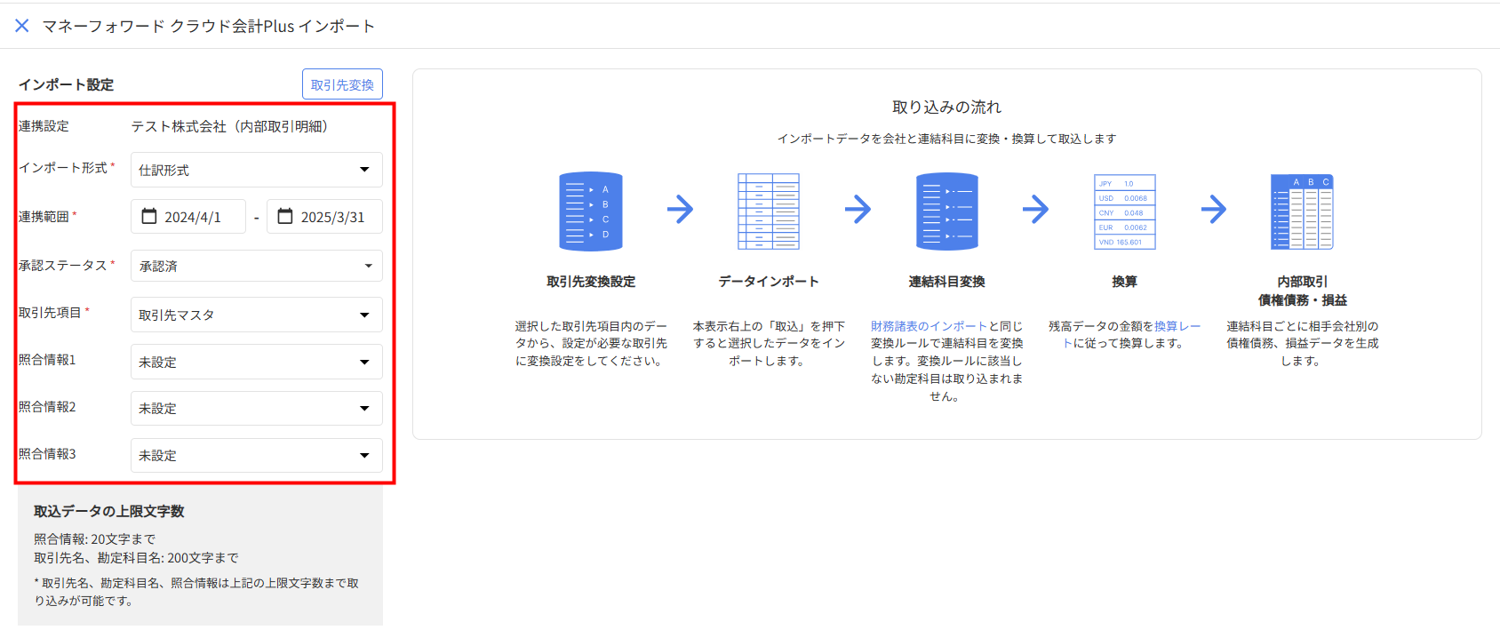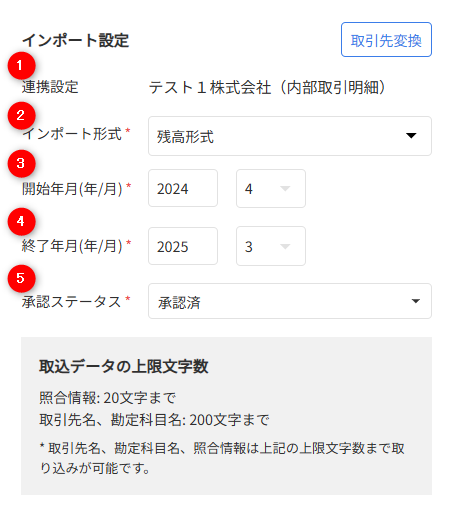 | ③ | 連携範囲 | 必須項目です。 内部取引明細をインポートする期間を指定します。 |