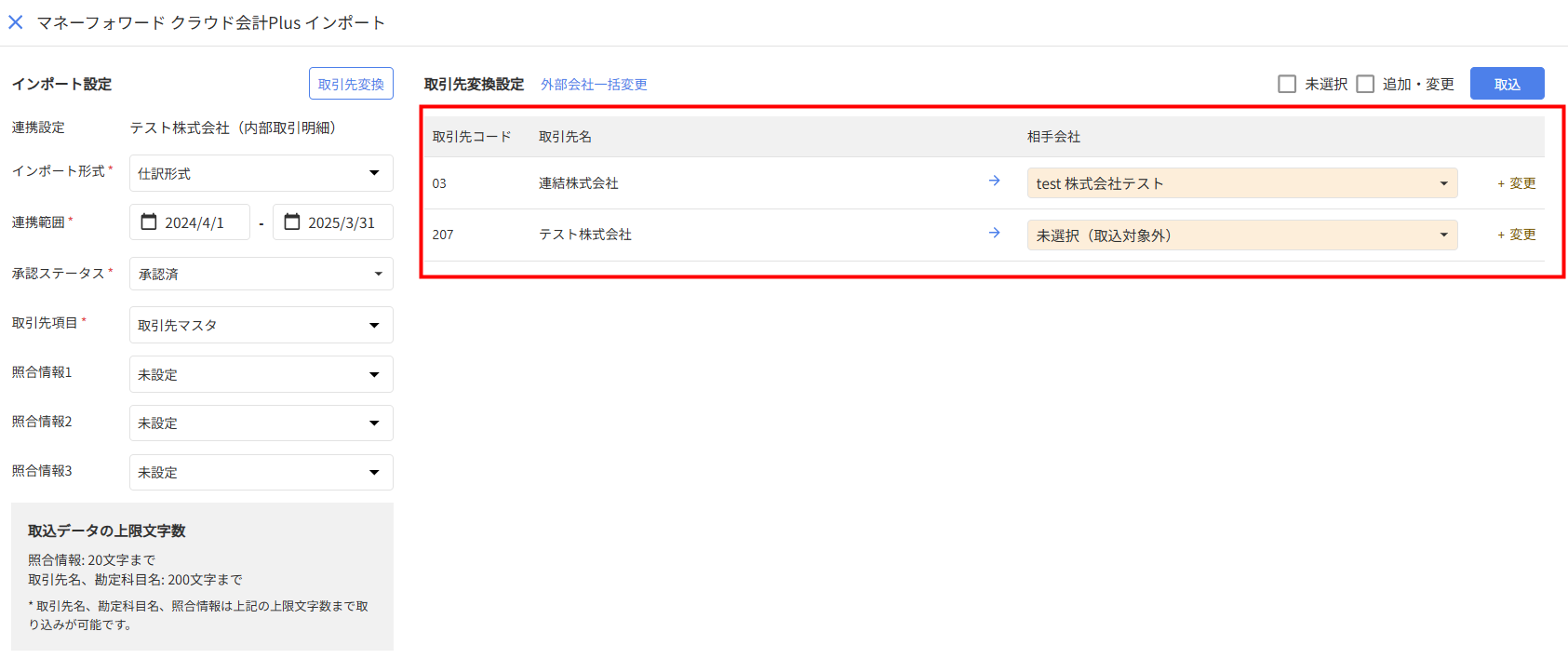「取引先変換設定」には、「取引先コード」「取引先名」「相手会社」等の項目が表示されます。