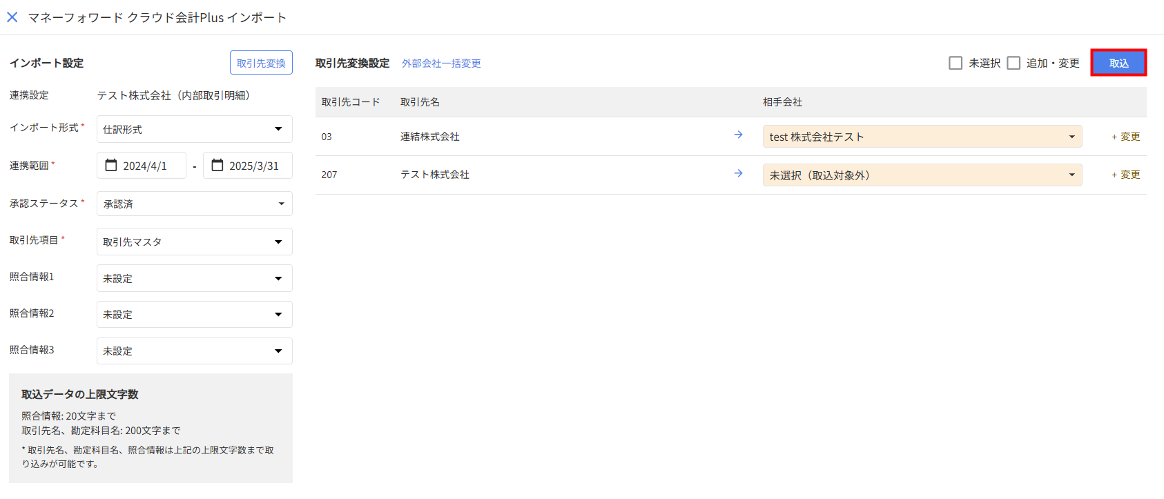 | ⑥ | 未選択 | チェックを入れると、「相手会社」が「未選択(取込対象外)」となっている取引先の行が表示されます。 |