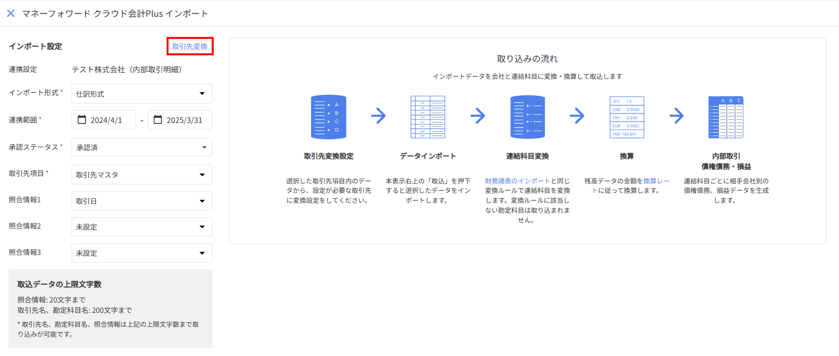 - 「マネーフォワード クラウド会計Plus インポート」画面でインポート設定を行います。