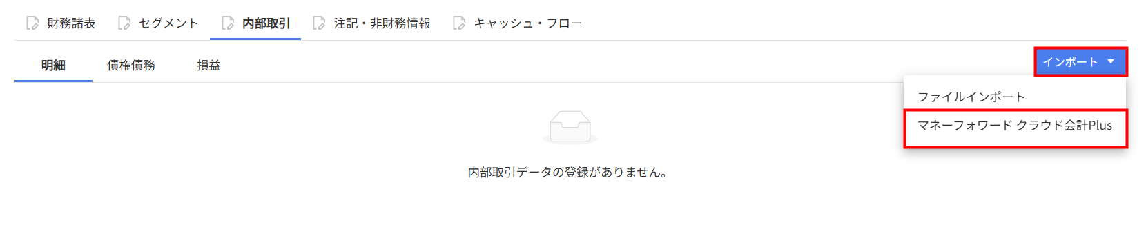 - 「内部取引」>「明細」画面右上の「インポート」をクリックし、「マネーフォワード クラウド会計Plus」を選択します。