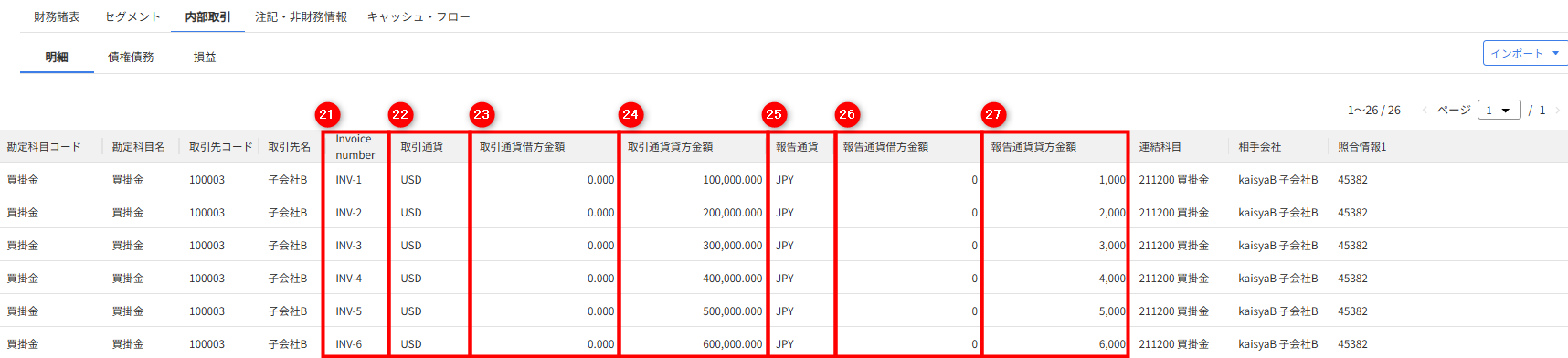| ㉑ | Invoice number | 内部取引明細のInvoice numberが表示されます。 Invoice numberは、明細突合表で取引通貨突合を行う際のマッチングキーとなります。 |