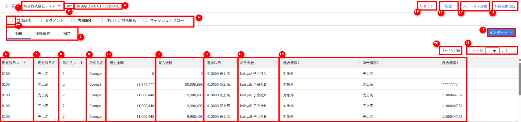 | ⑳ | 内部取引明細数 | 表示されている内部取引明細数と登録済みの内部取引明細の総数が「分子 / 分母」で表示されます。 |