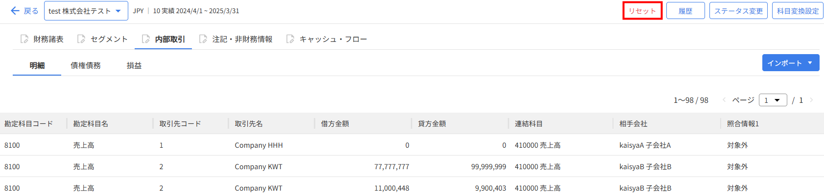 | ⑮ | リセット | クリックすると、対象の会社で取り込んだ連結パッケージデータや内部取引明細等を削除できます。 詳細はこちらの項をご参照ください。 |