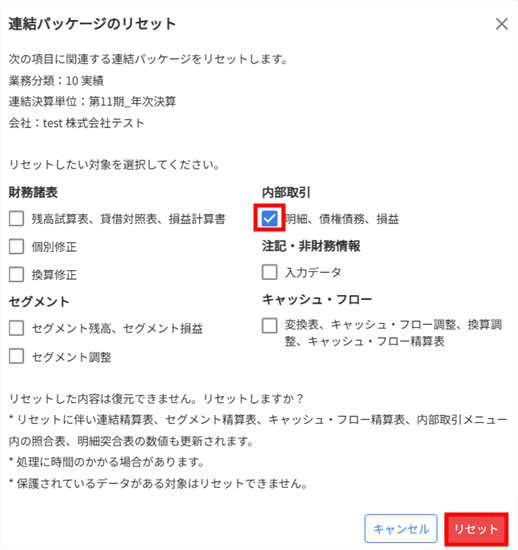 - 「連結パッケージのリセット」画面でリセットするデータにチェックを入れて注意書きを確認し、問題がなければ「リセット」をクリックします。