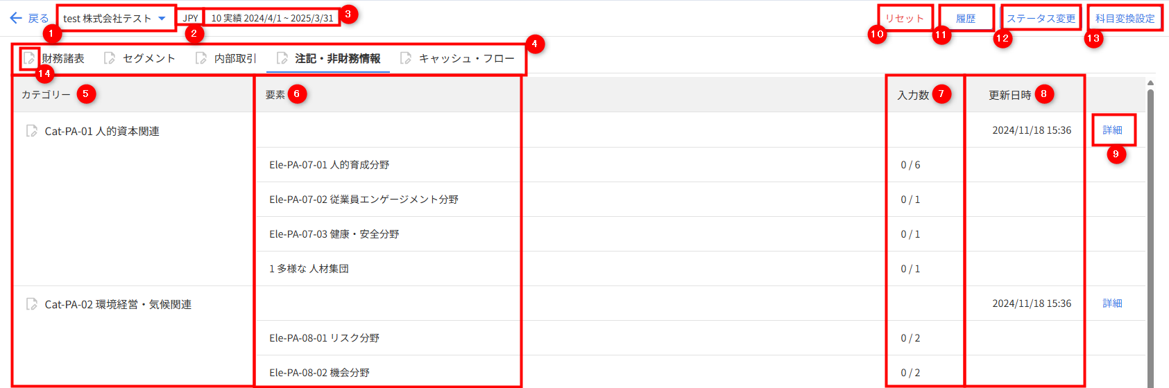 「注記・非財務情報」画面では、「連結決算準備」>「注記・非財務情報」画面で登録したフォーマット(カテゴリー・収集要素・収集項目)に沿って、会社ごとに注記・非財務情報の入力が可能です。