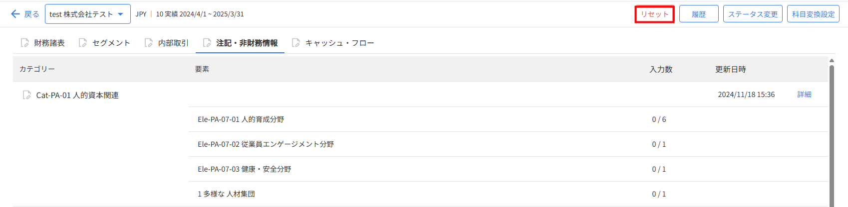 リセットクリックすると、対象の会社で入力した注記・非財務情報等を削除できます。