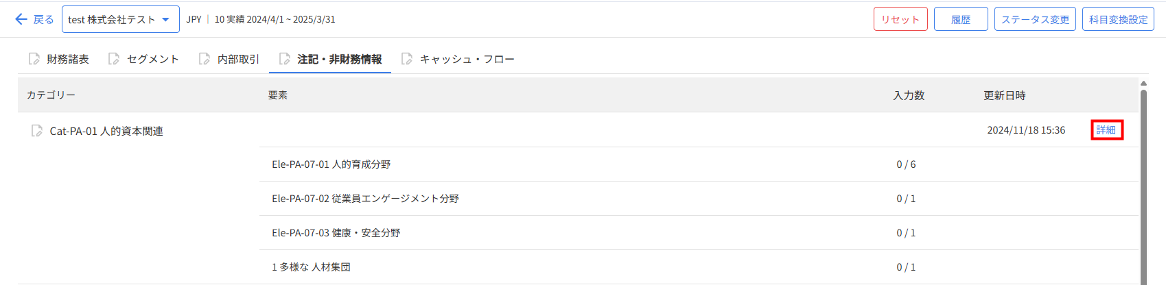 連結パッケージ」>「注記・非財務情報」画面で情報を入力するカテゴリーの「詳細」をクリックします。