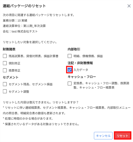 3. 「連結パッケージのリセット」画面でリセットするデータにチェックを入れて注意書きを確認し、問題がなければ「リセット」をクリックします。