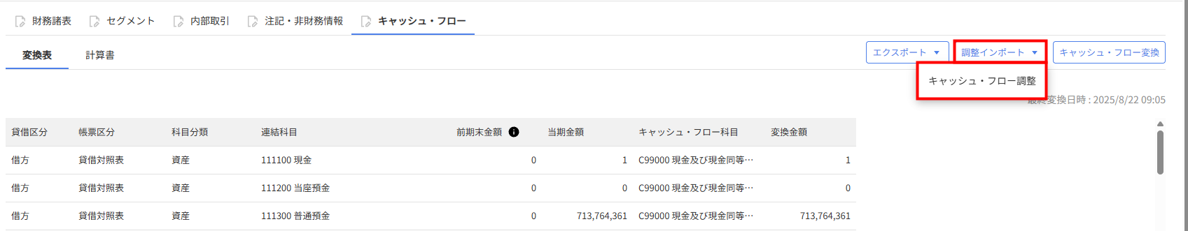 - 「計算書」画面右上の「調整インポート」をクリックし、「キャッシュ・フロー調整」を選択します。