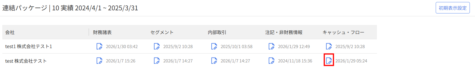 - 「単体決算報告」>「連結パッケージ」画面を開き、ファイルをインポートする会社の「キャッシュ・フロー」列に表示されているアイコンをクリックします。