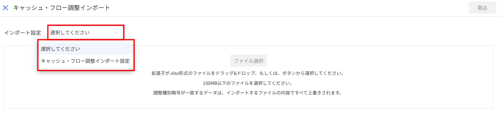 - 「キャッシュ・フロー調整インポート」画面で「インポート設定」のプルダウンをクリックし、事前に追加したインポート設定を選択します。