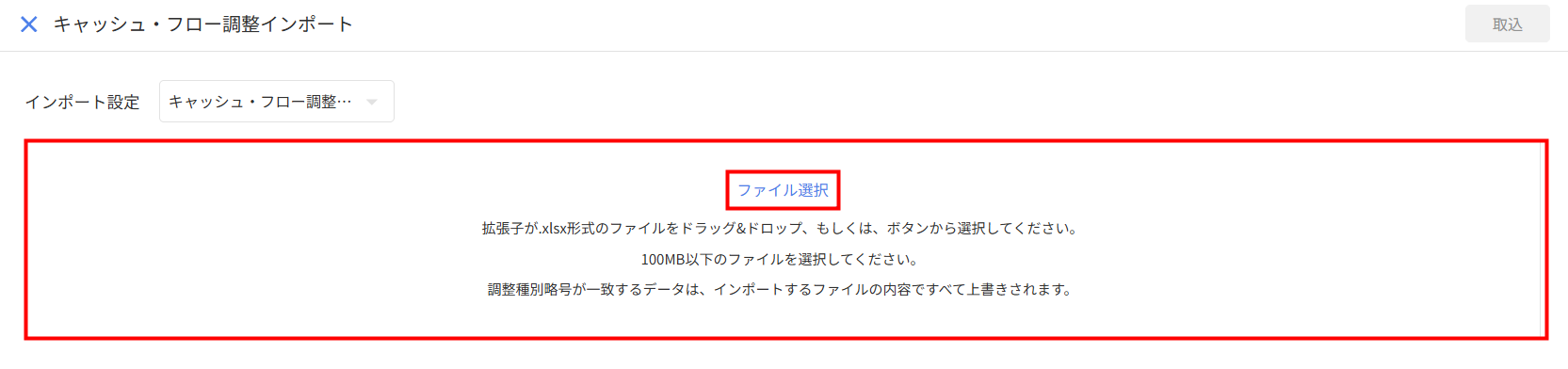 - 「ファイル選択」をクリックしてインポートするファイルを選択するか、ファイルをドラッグ&ドロップします。
