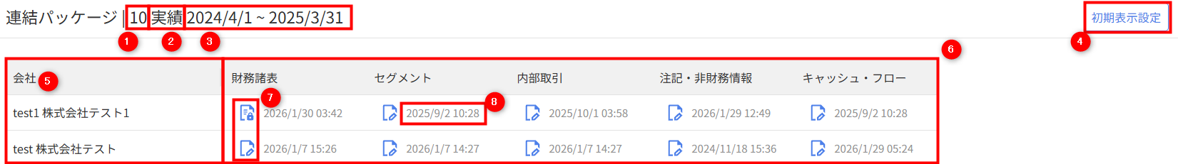 | ⑤ | 会社 | 表示中の連結決算単位に紐づく連結グループの会社が一覧で表示されます。 |