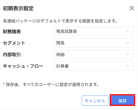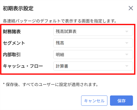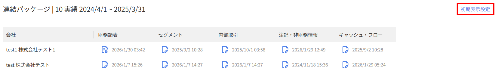 「初期表示設定」とは、連結パッケージ一覧画面において、各帳票タイプ(財務諸表・セグメント等)のデフォルトの表示先を事業者単位で指定できる機能です。