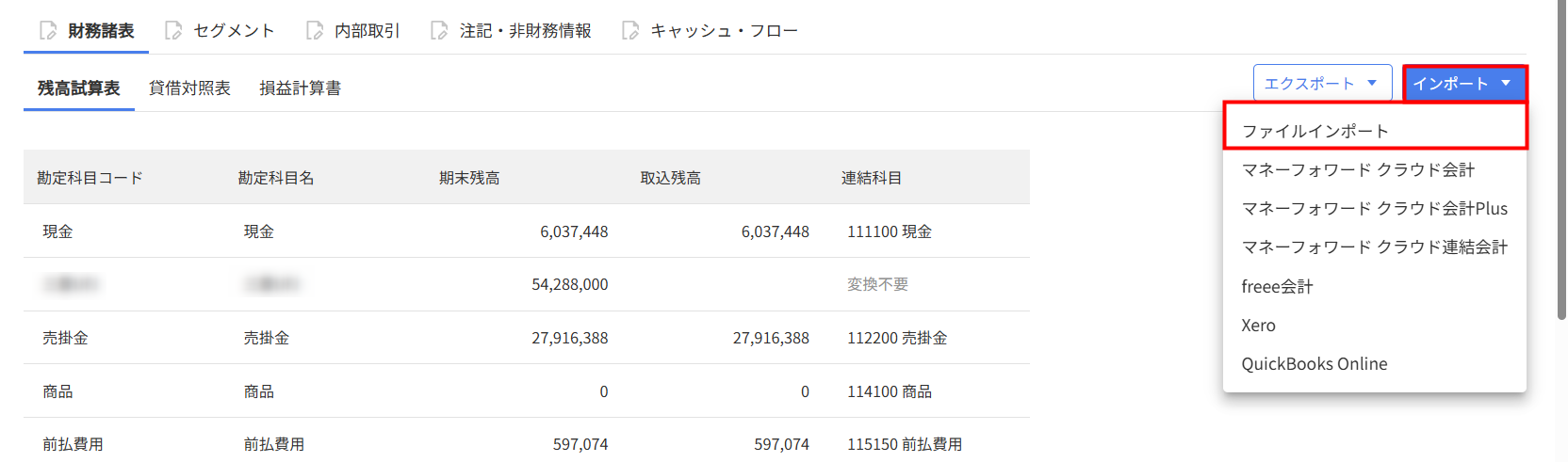 - 「残高試算表」画面右上の「インポート」をクリックし、「ファイルインポート」を選択します。