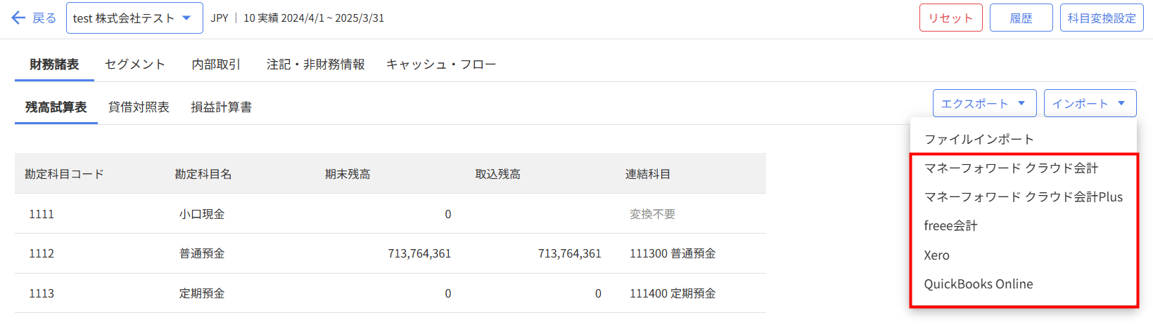 - 「セグメント」「内部取引」「キャッシュ・フロー」のデータが取り込み済みの状態で、科目変換設定を更新してインポートをすると、新しい設定で「セグメント」「内部取引」の再インポートが自動で実行されます。また、キャッシュ・フロー変換も再実行されます。