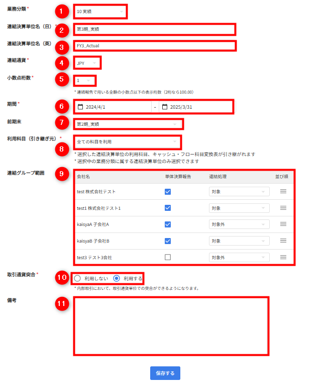 | ③ | 連結決算単位名(英) | 連結決算単位の英語名を入力できます。 |