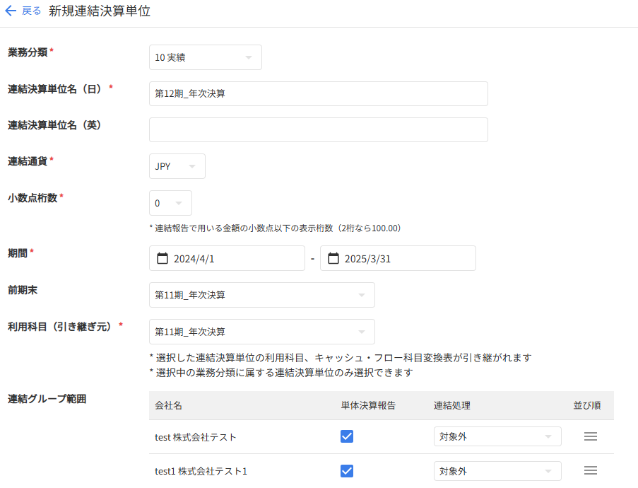 「連結決算単位」画面では、連結決算単位を設定・管理できます。