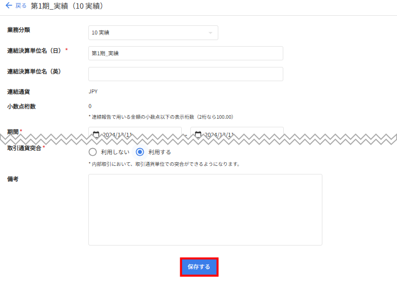 | ④ | 連結通貨 | 必須項目です。 対象の連結決算単位の連結決算報告で使用する通貨を選択します。 |