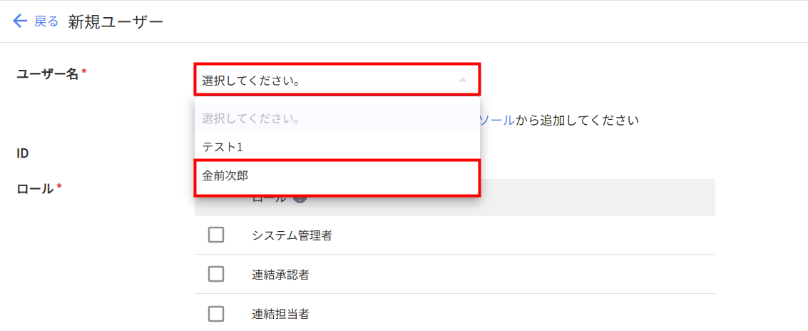 2. 「新規ユーザー」画面で「ユーザー名」のプルダウンをクリックし、追加するユーザーを選択します。