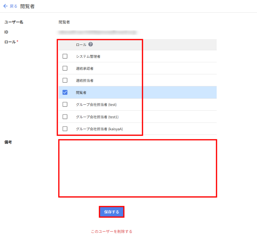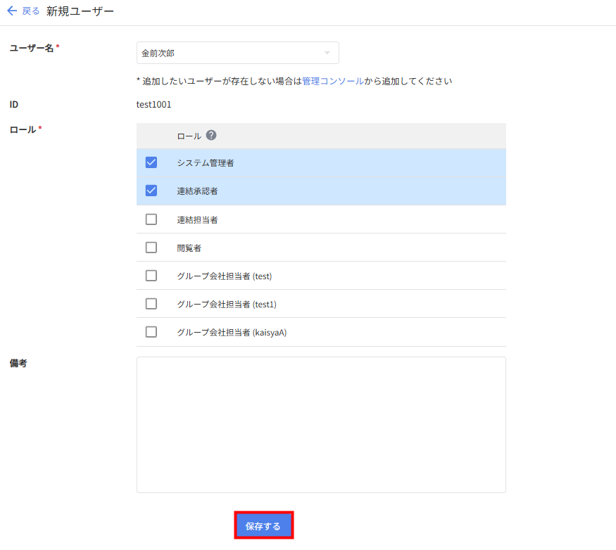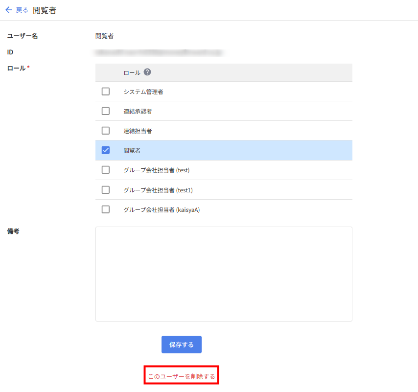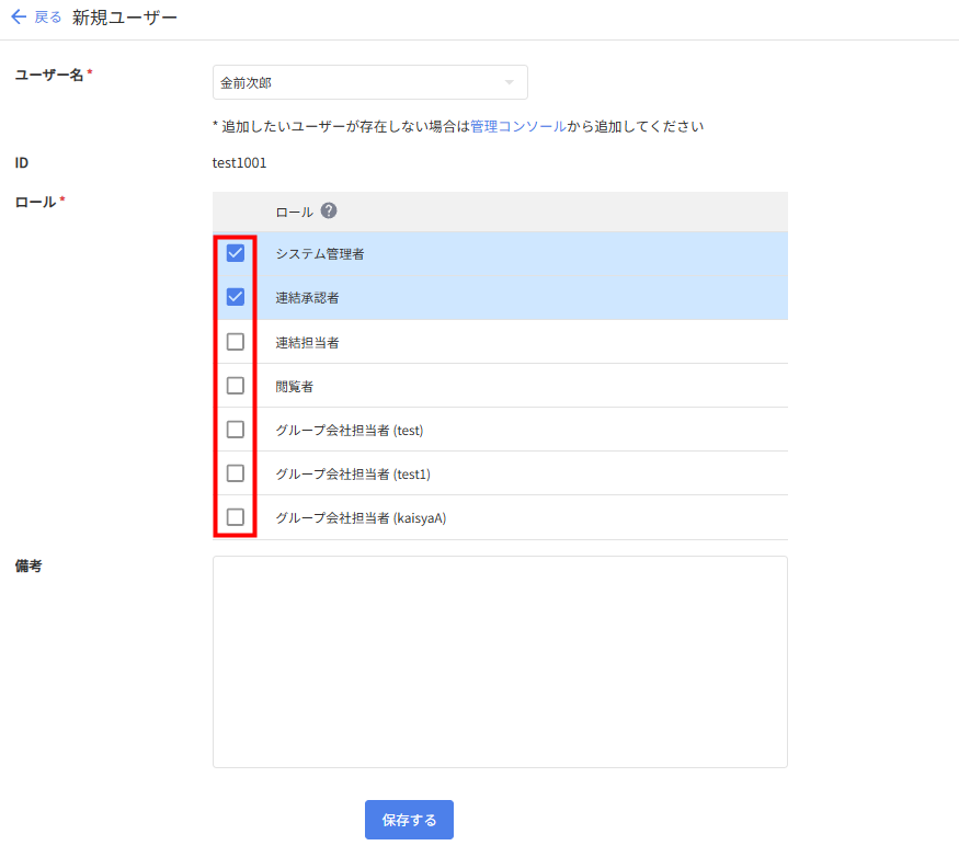 2. 「ロール」や「備考」を編集し、下部の「保存する」をクリックします。