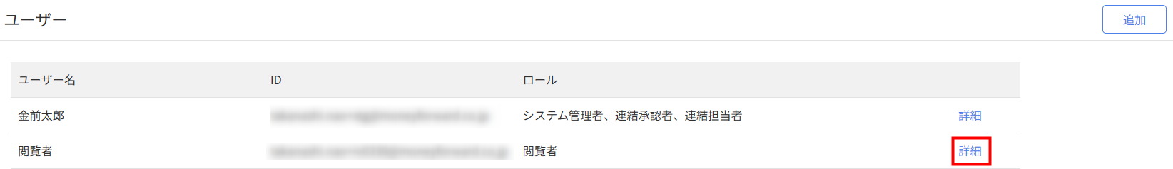 1. 「設定」>「ユーザー」画面で編集するユーザーの右側にある「詳細」をクリックします。