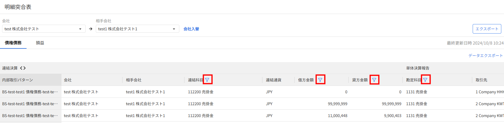 「明細突合表」画面では、グループ内の内部取引における認識差異の原因を確認するために、仕訳(取引)レベルの詳細なデータを確認できます。