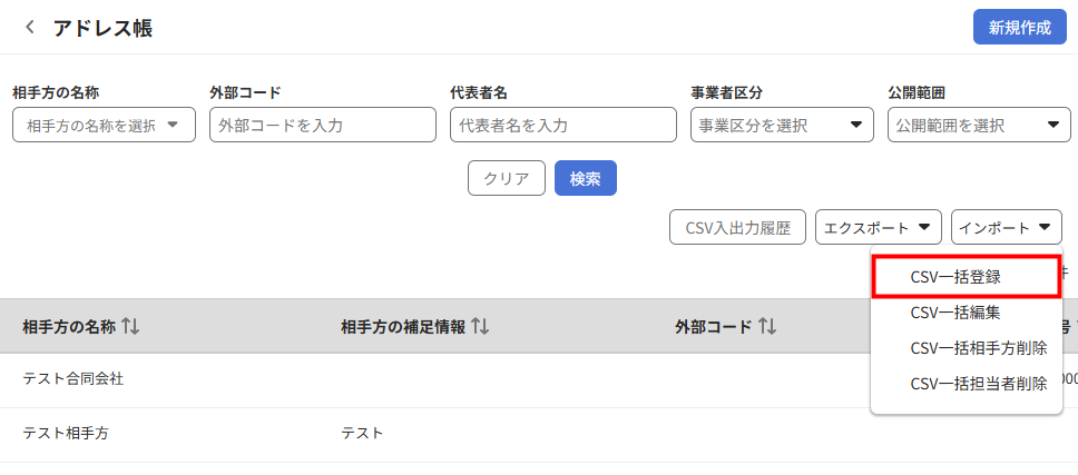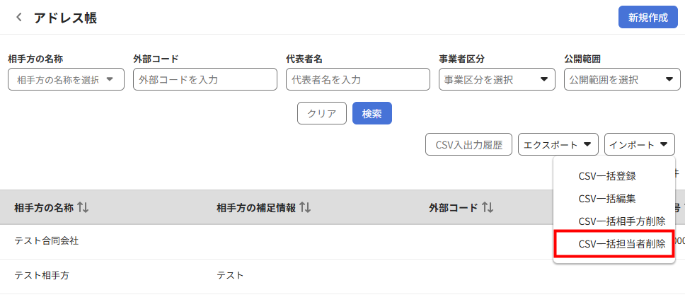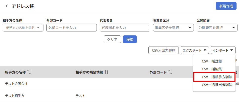 - 「インポート」をクリックし、「CSV一括相手方削除」を選択します。