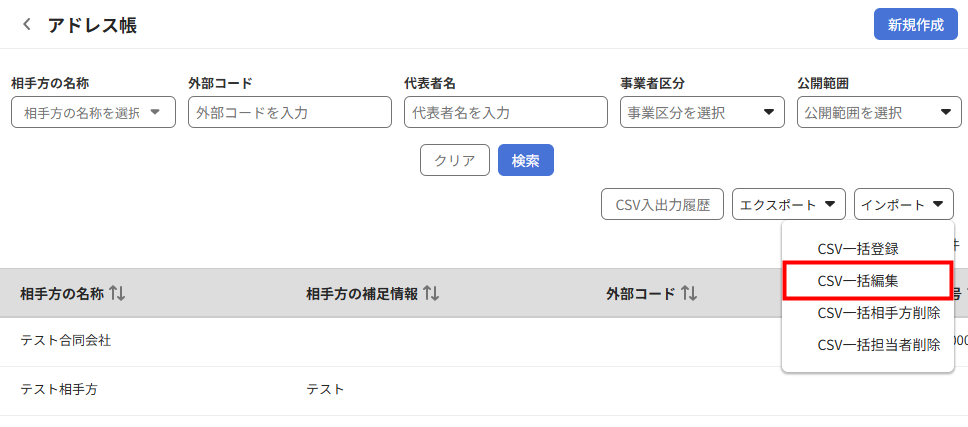 - 「アドレス帳」画面で「インポート」をクリックし、「CSV一括編集」を選択します。