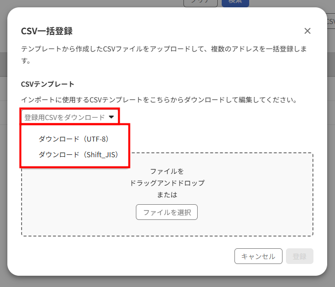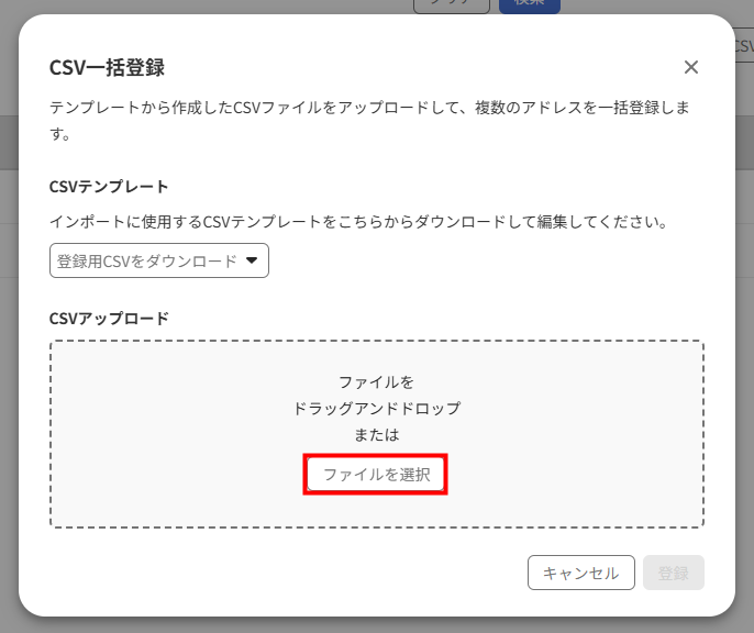 - 「CSV一括登録」画面で「ファイルを選択」をクリックして編集したCSVファイルを選択するか、ファイルをドラッグ&ドロップします。