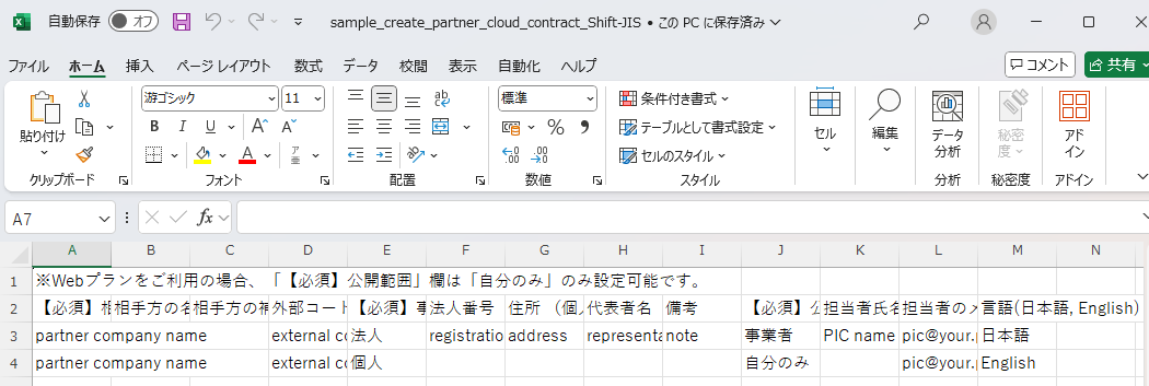 CSV一括登録でダウンロードしたテンプレートファイルには、具体例としてサンプルデータが入力されています。