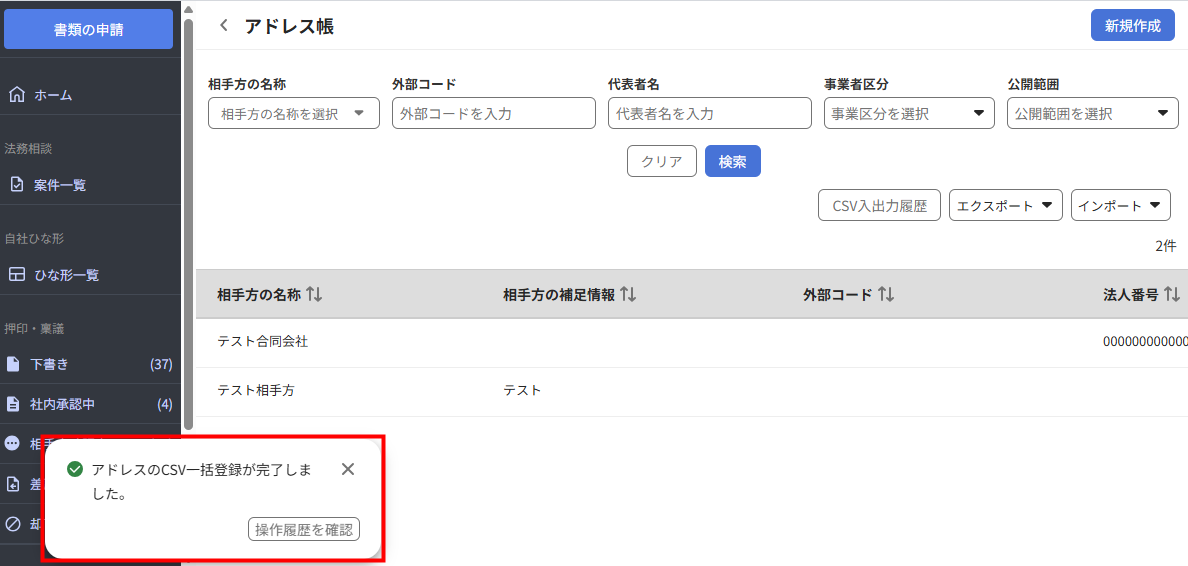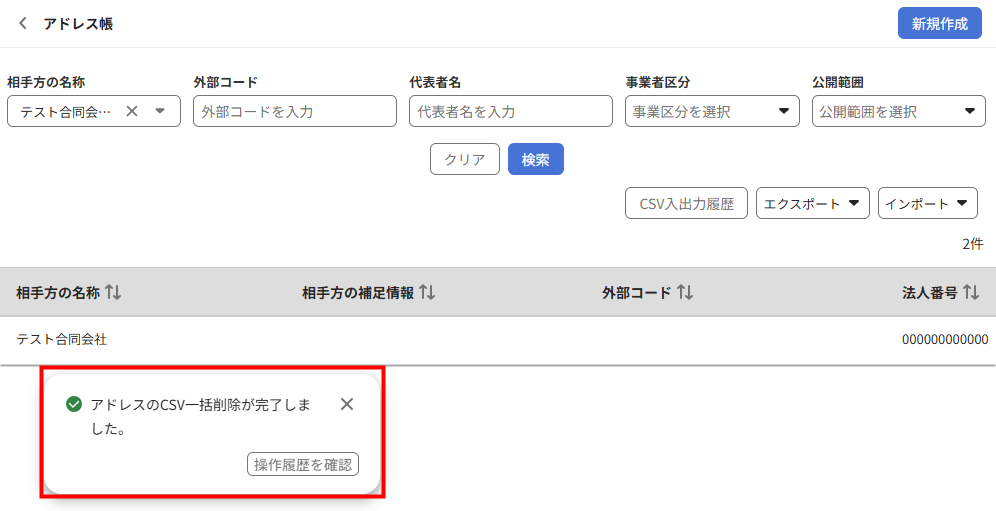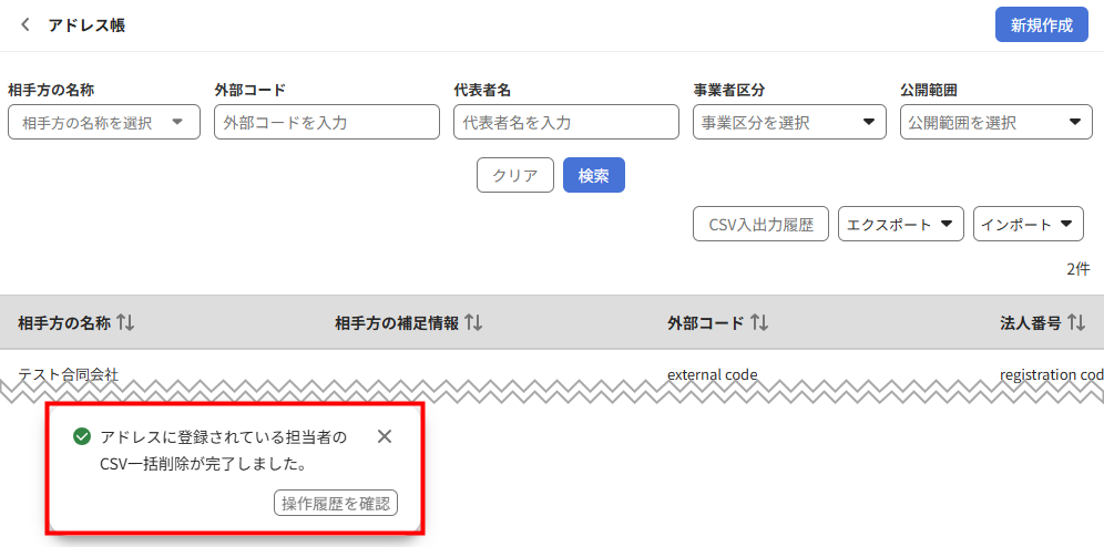 - 画面左下に「アドレスに登録されている担当者のCSV一括削除が完了しました。」というメッセージが表示されたことを確認します。