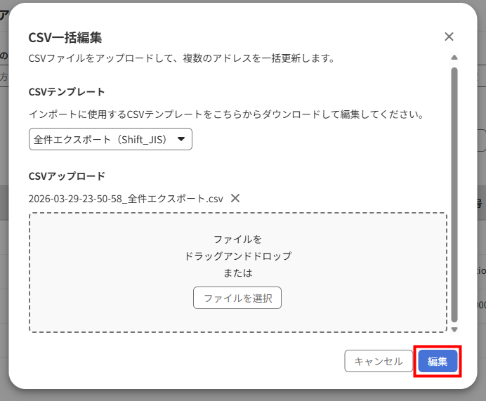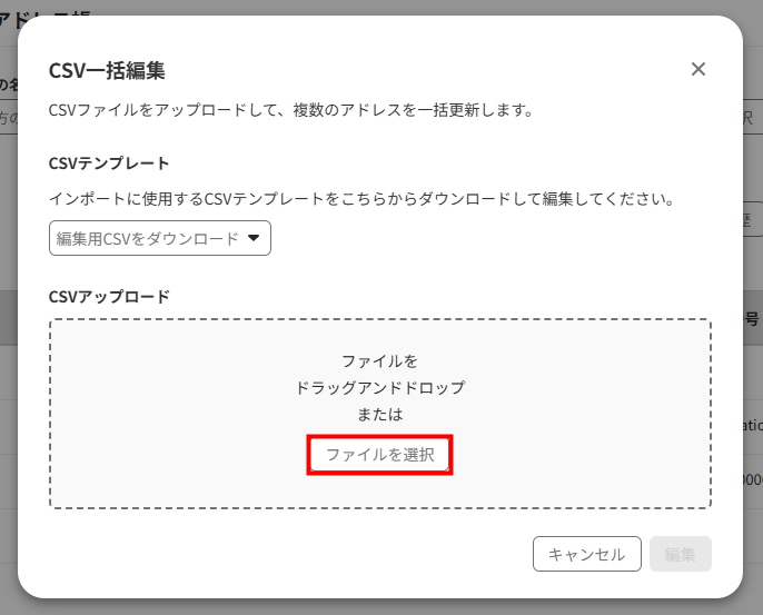 - 「CSV一括編集」画面で「ファイルを選択」をクリックして編集したCSVファイルを選択するか、ファイルをドラッグ&ドロップします。