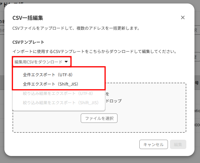 - 「CSV一括編集」画面で「編集用CSVをダウンロード」をクリックし、「全件エクスポート(UTF-8)」または「全件エクスポート(Shift_JIS)」を選択します。