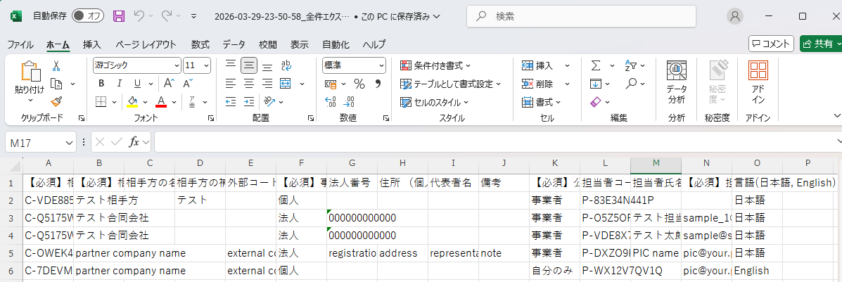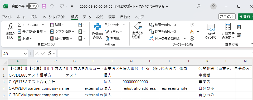 - CSVファイルを開き、削除する相手方が出力されていることを確認します。