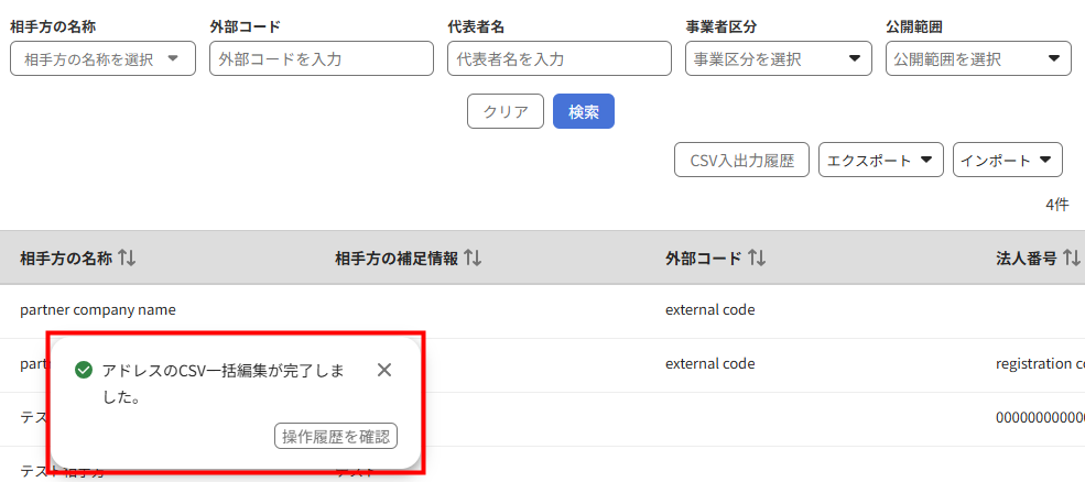 | 3 | ●行目:相手先情報が一致しないため、担当者の登録に失敗しました。複数の担当者を登録する場合、同じ相手先の情報(相手方の名称、外部コード、事業者区分など)で入力してください。 | 一致させる相手方情報については、こちらの項をご確認ください。 |