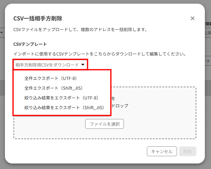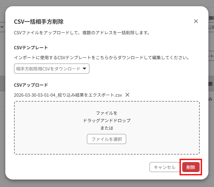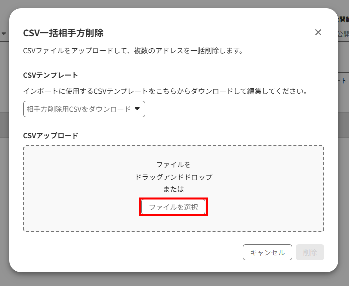- 「CSV一括相手方削除」画面で「ファイルを選択」をクリックして編集したCSVファイルを選択するか、ファイルをドラッグ&ドロップします。