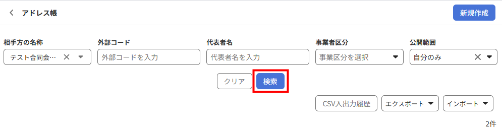 - 「アドレス帳」画面で削除する担当者が紐づく相手方を絞り込み検索します。