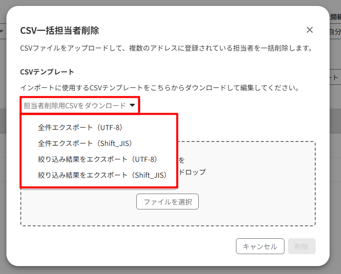 - 「インポート」をクリックし「CSV一括担当者削除」を選択します。