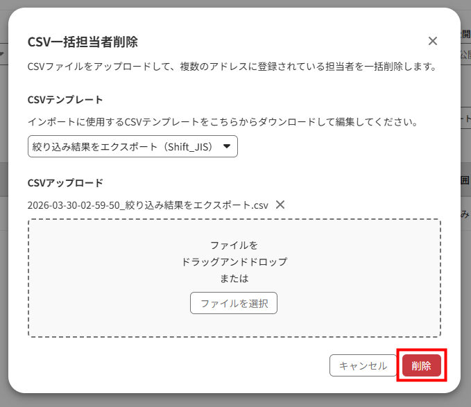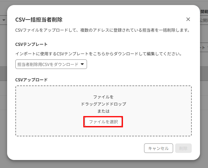 - 「CSV一括担当者削除」画面で「ファイルを選択」をクリックして編集したCSVファイルを選択するか、ファイルをドラッグ&ドロップします。
