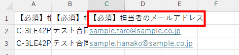 | 2 | ●行目:担当者のメールアドレスが重複しています。入力内容を確認してください。 | 該当行に入力されている担当者のメールアドレスが重複している可能性があります。 入力内容を確認し、再度CSVファイルをインポートしてください。 |