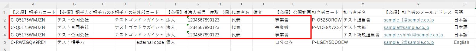 CSV一括登録およびCSV一括編集で、法人の相手方に複数の担当者が紐づく場合、1行ずつ記載します。